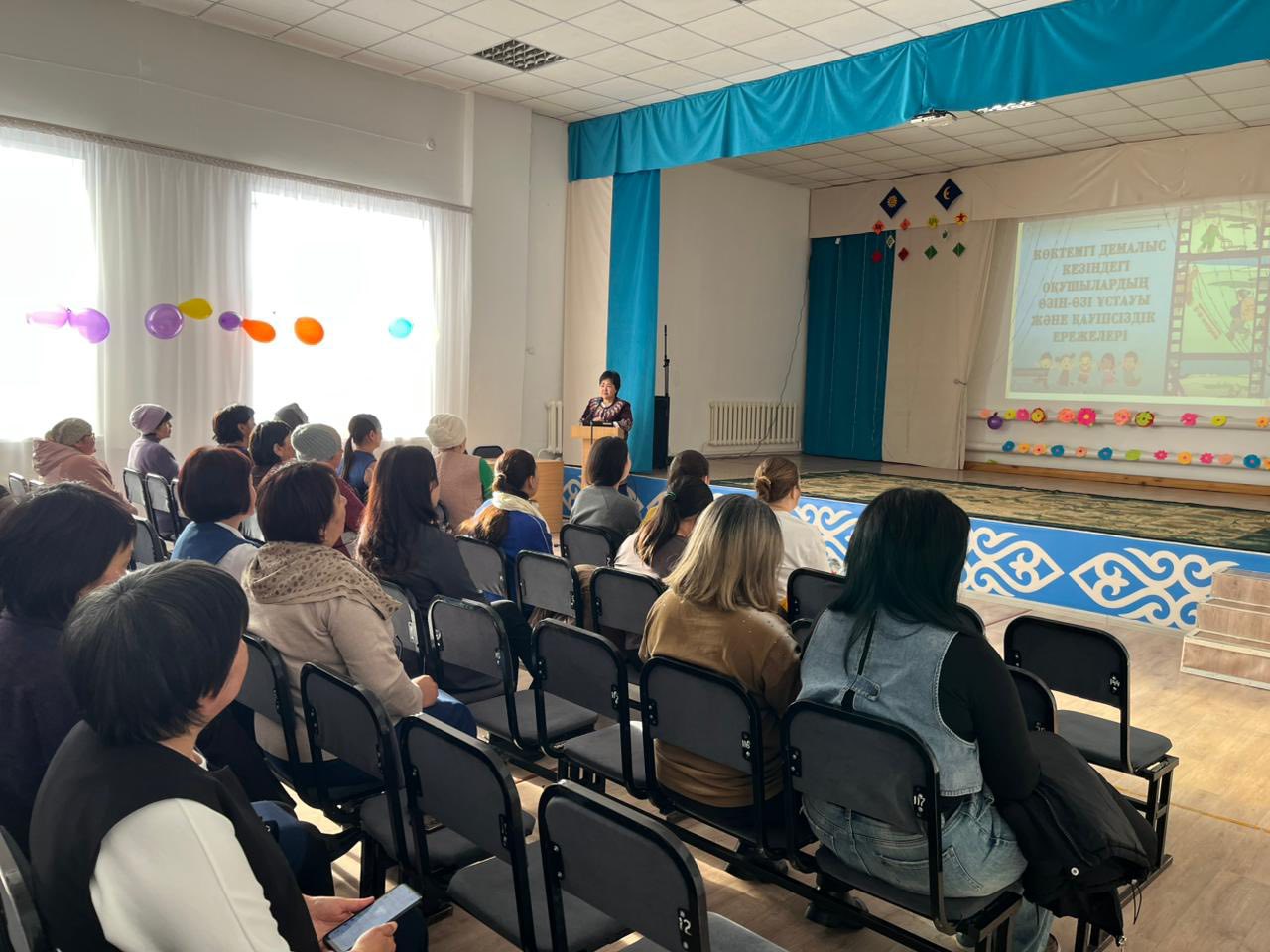 13 наурыз Адал азамат біртұтас тәрбие аясында және АПҚО бойынша “ Ақыл айтпа жол көрсет” тақырыбында жалпы мектепішілік жиналыс өтті. Күн тәртібі бойынша директордың тәрбие орынбасары Калабаева А. Е. Жиналысты ашып, ата -аналарға балаға ақыл айтпай, отбасында үлгі болуға кеңес берді. Сонымен қатар күн тәртібі бойынша Оқу ісінің орынбасары Сагдеева Д. М. Психолог Шамилова Б. А. Әлеуметтік педагог Сабитова А.С кәсіптік бағдар беруші ұстаз Нуртаева М. Б. Күн тәртібіндегі тақырыптар бойынша баяндама жасады. Кейін ата- аналар пән мұғалімдерімен жеке кездесіп балаларының сабақ үлгерімдері бойынша ақпарат алды.